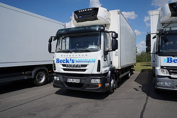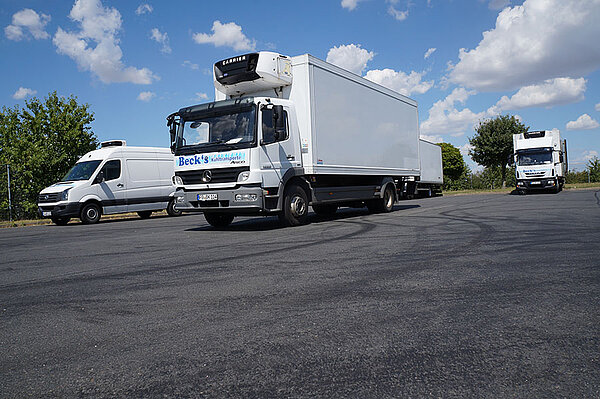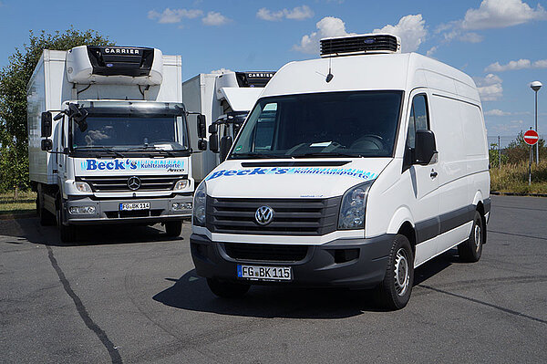 Fuhrpark: LKW mit Transportkühlung und Rohrbahn, Kleintransporter mit Transportkühlung, Verkaufsanhänger mit Kühltheke